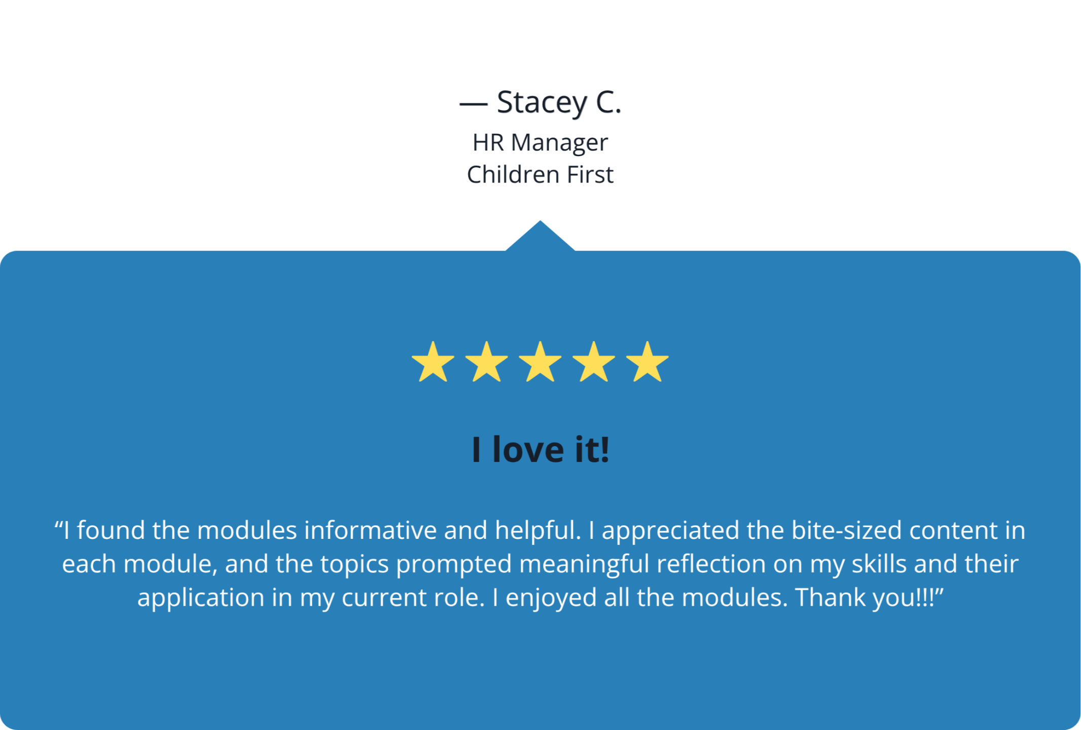 Your team can complete the 12 engaging modules in their own time at their own pace, no pulling people off the floor for all-day workshops.